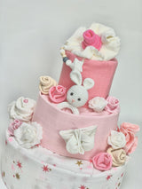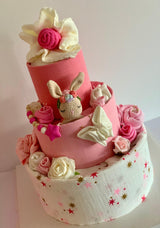 This adorable Nappy Cake is a perfect present for a baby shower or a gift to welcome the baby once it arrives.